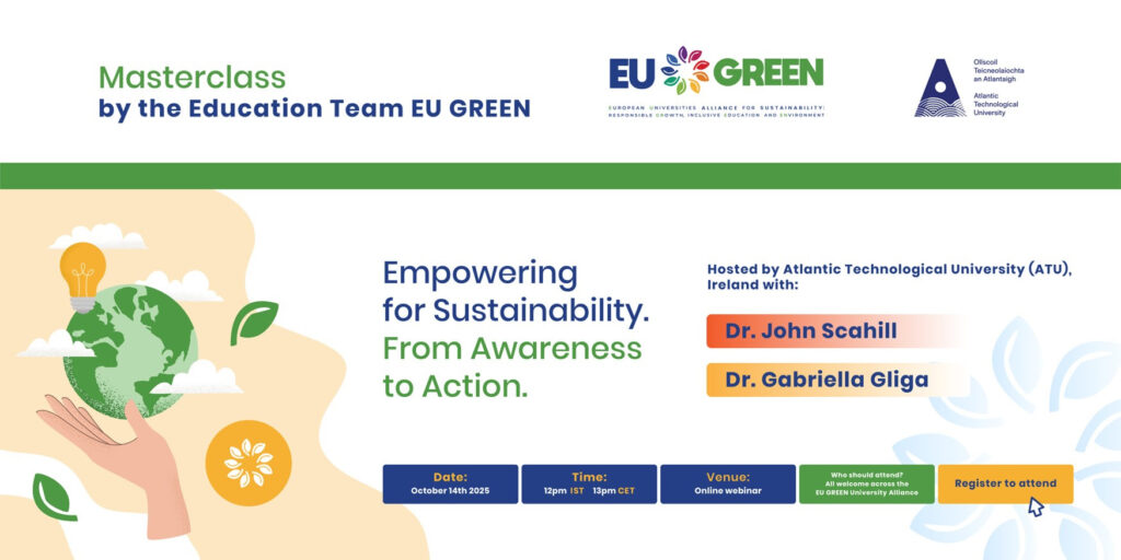This EU GREEN masterclass will explore how higher education can go beyond awareness-raising and foster real sustainability action. “Empowering for Sustainability: From Awareness to Action” will present concrete case studies from Atlantic Technological University (ATU) and EU-level projects, showing how purposeful educational design can activate students and staff toward transformative sustainability practices. From experiential learning to co-created resources, participants will discover how universities can cultivate a culture of sustainability in everyday academic life.