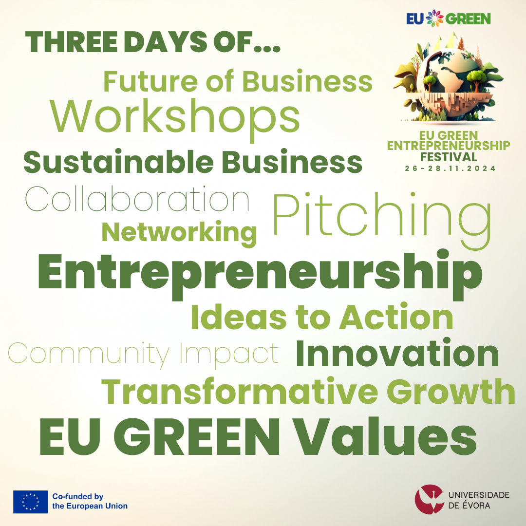 The EU GREEN Entrepreneurship Festival is set to take place from November 26 to 28, 2024, at the University of Évora, Portugal, bringing together aspiring entrepreneurs, academic staff, and industry leaders to foster innovation and sustainability in business. This flagship event will showcase the EU GREEN Alliance’s commitment to empowering students and professionals with the tools and knowledge to drive positive change through entrepreneurship.