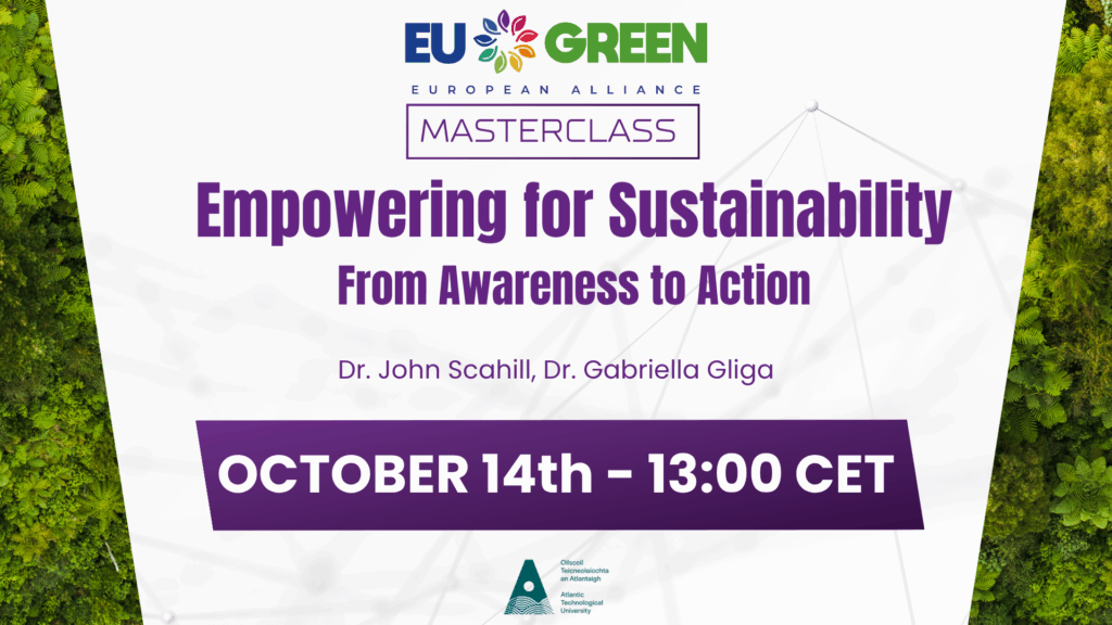 This EU GREEN masterclass will explore how higher education can go beyond awareness-raising and foster real sustainability action. “Empowering for Sustainability: From Awareness to Action” will present concrete case studies from Atlantic Technological University (ATU) and EU-level projects, showing how purposeful educational design can activate students and staff toward transformative sustainability practices. From experiential learning to co-created resources, participants will discover how universities can cultivate a culture of sustainability in everyday academic life.