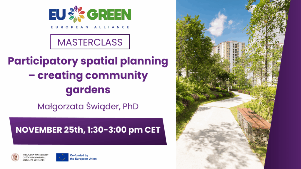 How can urban and rural communities actively shape their own green spaces? This EU GREEN Masterclass, led by Dr. Małgorzata Świąder from the Wrocław University of Environmental and Life Sciences, will offer insights into participatory spatial planning, with a special focus on the development of community gardens. As the 2024 Climate Person of the Year (Young Scientist category) in Poland, Dr. Świąder brings expertise in environmental indicators and sustainable planning practices.
