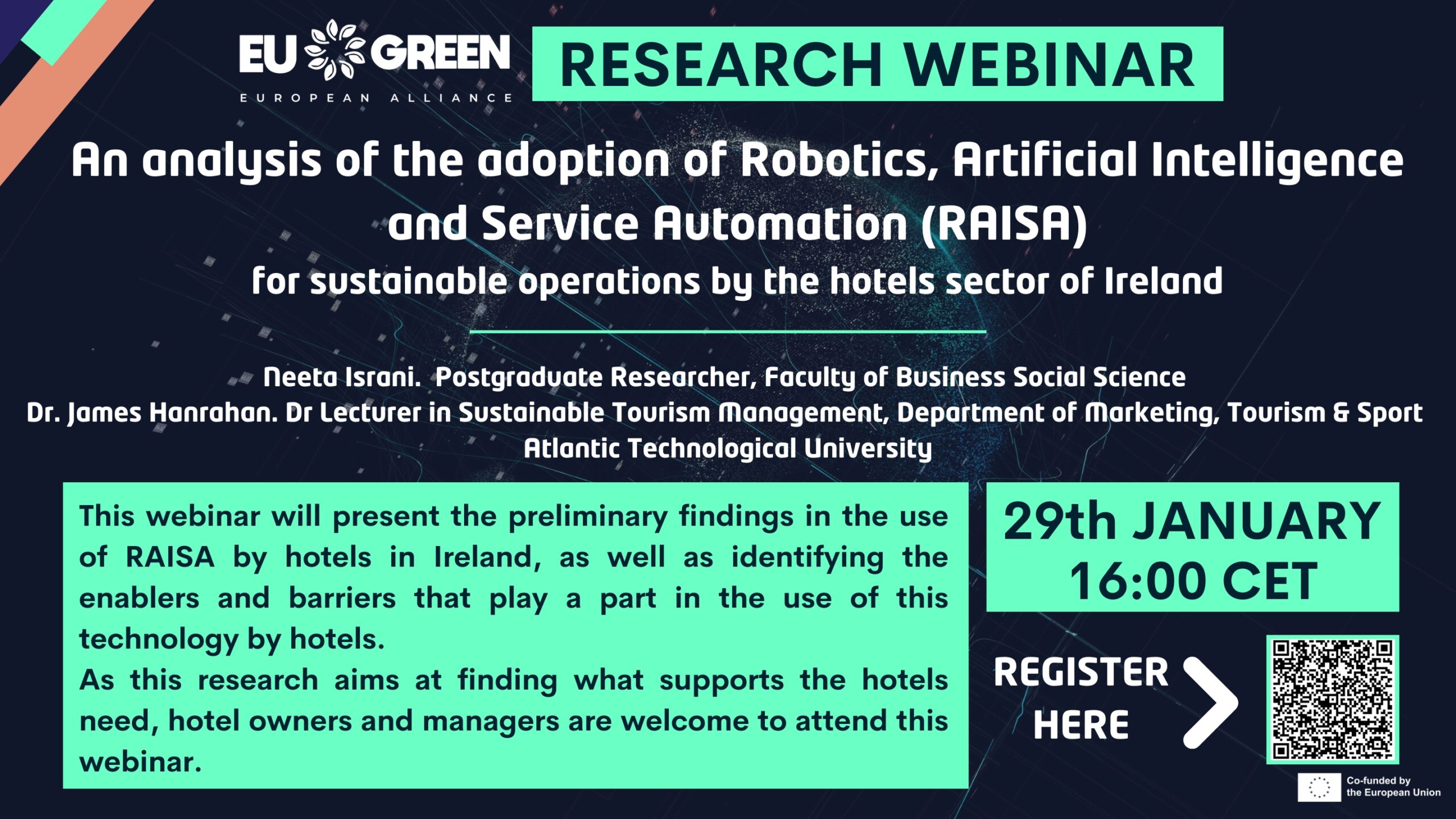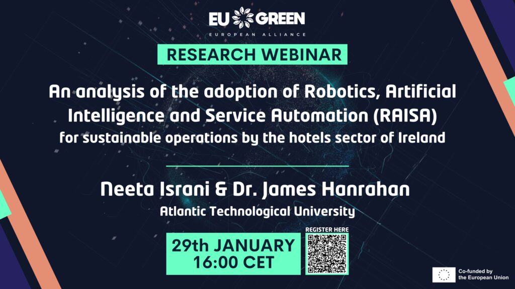 This webinar will present the preliminary findings in the use of RAISA by hotels in Ireland, as well as identifying the enablers and barriers that play a part in the use of this technology by hotels. As this research aims at finding what supports the hotels need, hotel owners and managers are welcome to attend this webinar.